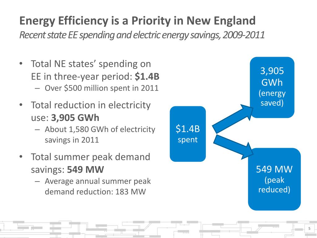 Energy Efficiency is a Priority in New EnglandRecent state EE spending and electric energy savings, 2009-2011 • Total NE states’ spending on EE in three-year period: $1.4B • Over $500 million spent in 2011 • Total reduction in electricity use: 3,905 GWh • About 1,580 GWh of electricity savings in 2011 • Total summer peak demand savings: 549 MW • Average annual summer peak demand reduction: 183 MW