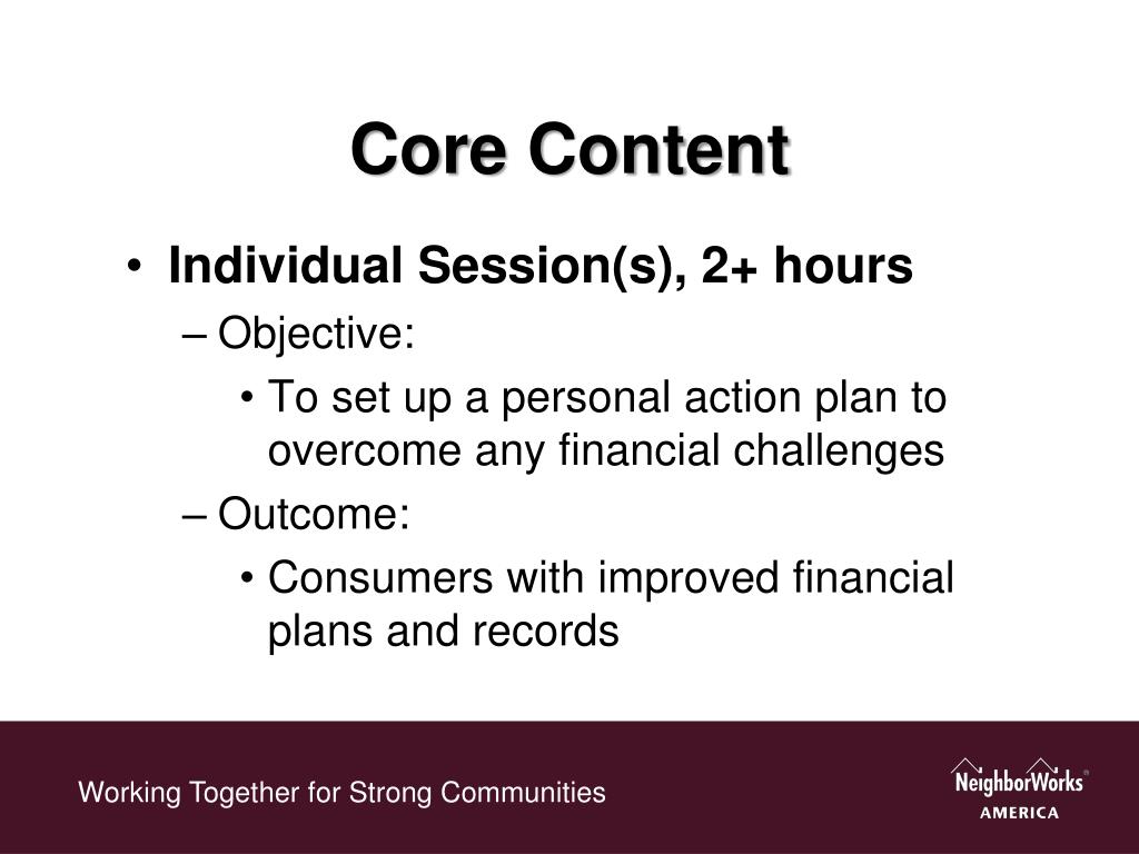 Core Content • Individual Session(s), 2+ hours • Objective: • To set up a personal action plan to overcome any financial challenges • Outcome: • Consumers with improved financial plans and records