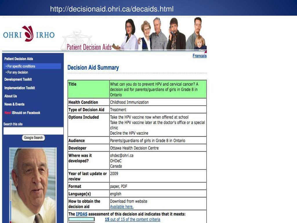 What Effects Do Decision Aids Have? • Patients feel more informed • Have better knowledge and understanding of clinical issue • Have realistic expectations about treatment • Are equally or more satisfied with the care they receive • Sometimes make different choices than uninformed patients O’Connor et al. Cochrane Systematic Review 2003