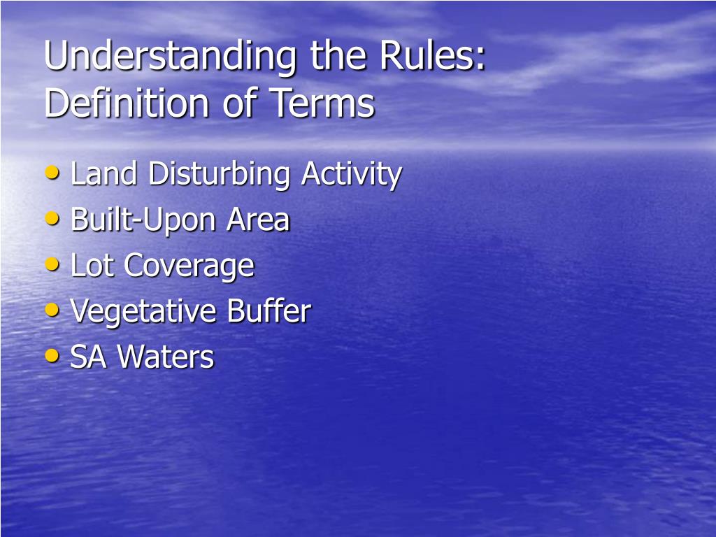 Understanding the Rules:Definition of Terms • Land Disturbing Activity • Built-Upon Area • Lot Coverage • Vegetative Buffer • SA Waters