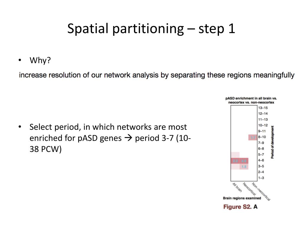 Spatial partitioning – step 1 • Why? • Select period, in which networks are most enriched for pASD genes period 3-7 (10-38 PCW)