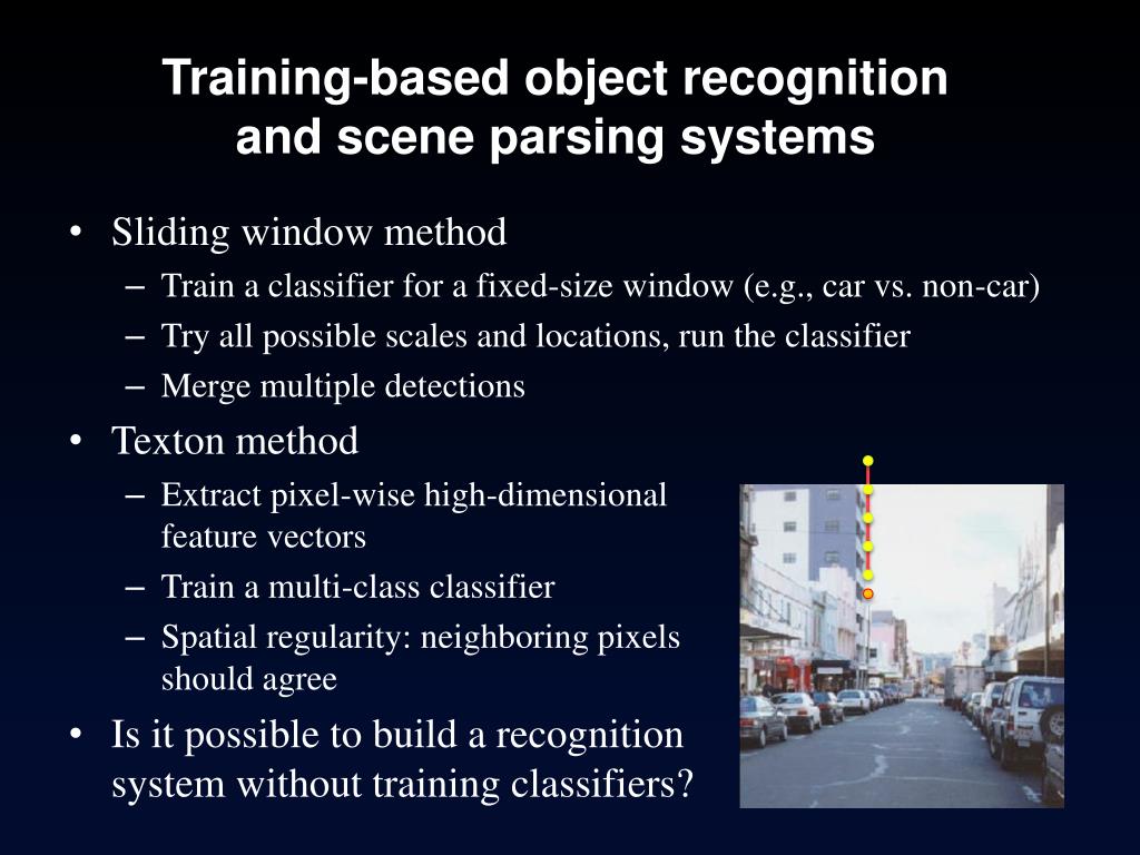 Training-based object recognition and scene parsing systems • Texton method • Extract pixel-wise high-dimensional feature vectors • Train a multi-class classifier • Spatial regularity: neighboring pixels should agree • Is it possible to build a recognition system without training classifiers? • Sliding window method • Train a classifier for a fixed-size window (e.g., car vs. non-car) • Try all possible scales and locations, run the classifier • Merge multiple detections