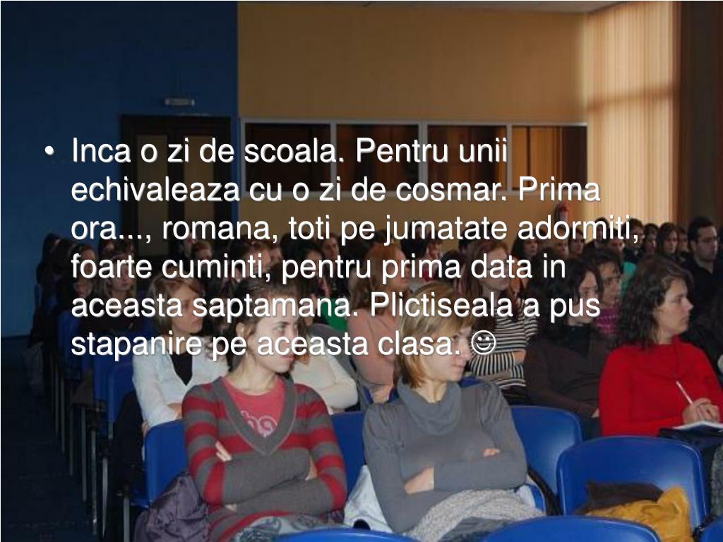 Inca o zi de scoala. Pentru unii echivaleaza cu o zi de cosmar. Prima ora..., romana, toti pe jumatate adormiti, foarte cuminti, pentru prima data in aceasta saptamana. Plictiseala a pus stapanire pe aceasta clasa.