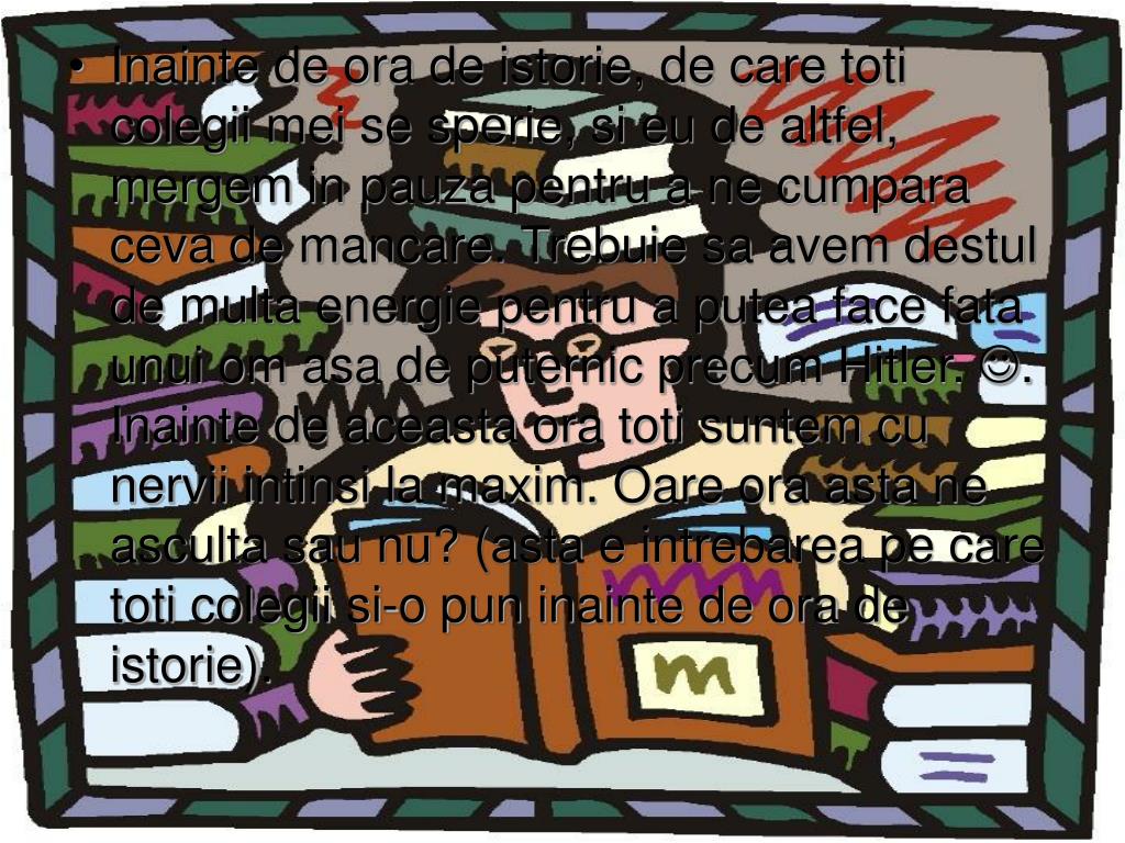 Inainte de ora de istorie, de care toti colegii mei se sperie, si eu de altfel, mergem in pauza pentru a ne cumpara ceva de mancare. Trebuie sa avem destul de multa energie pentru a putea face fata unui om asa de puternic precum Hitler. . Inainte de aceasta ora toti suntem cu nervii intinsi la maxim. Oare ora asta ne asculta sau nu? (asta e intrebarea pe care toti colegii si-o pun inainte de ora de istorie).