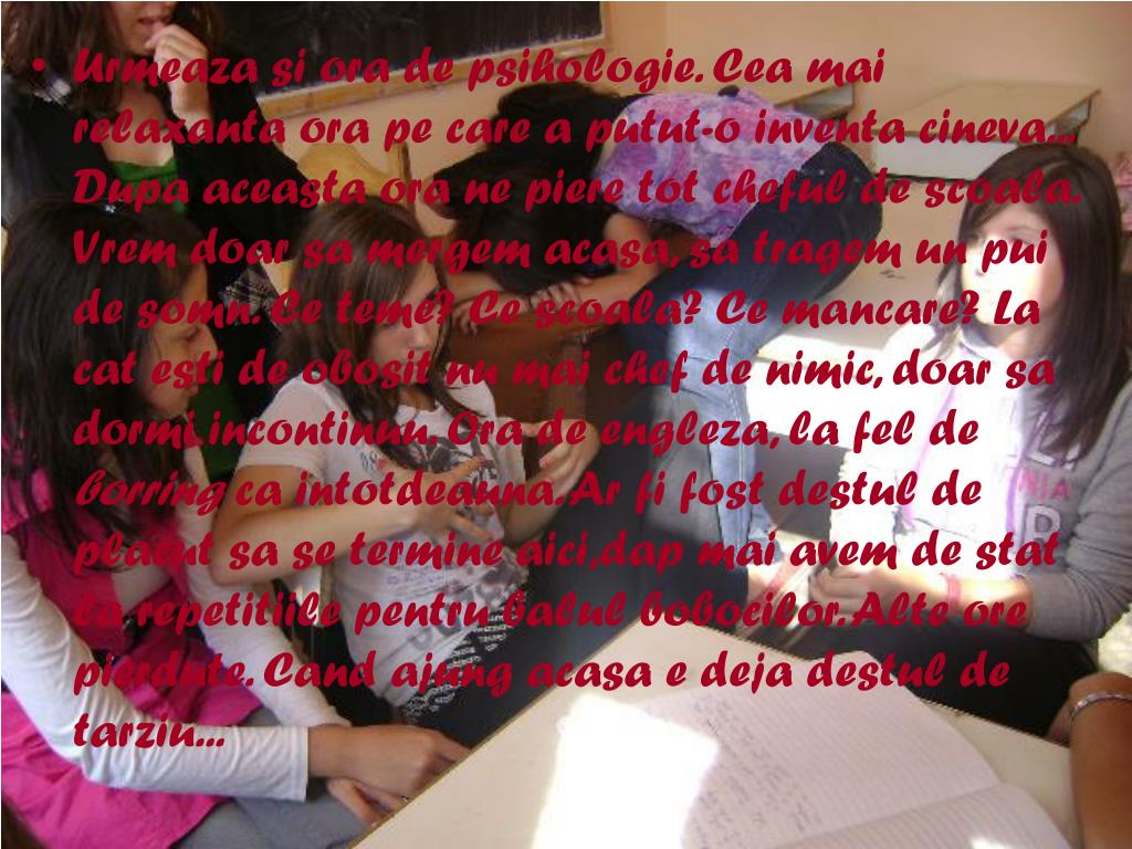 Urmeaza si ora de psihologie. Cea mai relaxanta ora pe care a putut-o inventa cineva... Dupa aceasta ora ne piere tot cheful de scoala. Vrem doar sa mergem acasa, sa tragem un pui de somn. Ce teme? Ce scoala? Ce mancare? La cat esti de obosit nu mai chef de nimic, doar sa dormi incontinuu. Ora de engleza, la fel de borring ca intotdeauna. Ar fi fost destul de placut sa se termine aici,dap mai avem de stat la repetitiile pentru balul bobocilor. Alte ore pierdute. Cand ajung acasa e deja destul de tarziu...