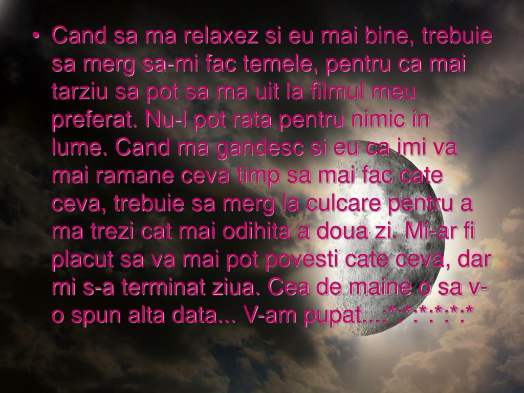 Cand sa ma relaxez si eu mai bine, trebuie sa merg sa-mi fac temele, pentru ca mai tarziu sa pot sa ma uit la filmul meu preferat. Nu-l pot rata pentru nimic in lume. Cand ma gandesc si eu ca imi va mai ramane ceva timp sa mai fac cate ceva, trebuie sa merg la culcare pentru a ma trezi cat mai odihita a doua zi. Mi-ar fi placut sa va mai pot povesti cate ceva, dar mi s-a terminat ziua. Cea de maine o sa v-o spun alta data... V-am pupat...:*:*:*:*:*:*