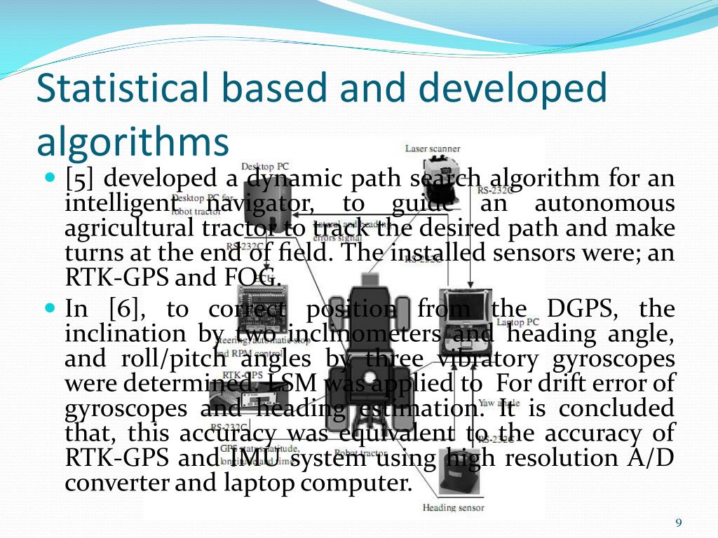 Statistical based and developed algorithms • [5] developeda dynamic path search algorithm for an intelligent navigator, to guide an autonomous agricultural tractor to track the desired path and make turns at the end of field. The installed sensors were; an RTK-GPS and FOG. • In [6], to correct position from the DGPS, the inclination by two inclinometers and heading angle, and roll/pitch angles by three vibratory gyroscopes were determined. LSM was applied to For drift error of gyroscopes and heading estimation. It is concluded that, this accuracy was equivalent to the accuracy of RTK-GPS and IMU system using high resolution A/D converter and laptop computer.