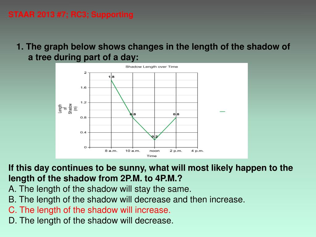 STAAR 2013 #7; RC3; Supporting 1. The graph below shows changes in the length of the shadow of a tree during part of a day: If this day continues to be sunny, what will most likely happen to the length of the shadow from 2P.M. to 4P.M.? A. The length of the shadow will stay the same. B. The length of the shadow will decrease and then increase. C. The length of the shadow will increase. D. The length of the shadow will decrease.