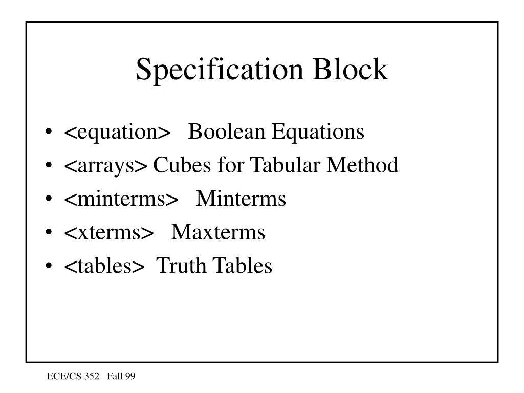 Specification Block • <equation> Boolean Equations • <arrays> Cubes for Tabular Method • <minterms> Minterms • <xterms> Maxterms • <tables> Truth Tables