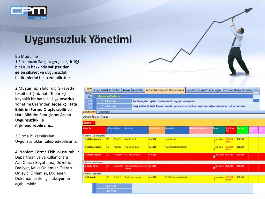 Uygunsuzluk Yönetimi Bu Modül ile 1.Firmanızın Satışını gerçekleştirdiği bir Ürün hakkında Müşteriden gelen şikayet ve uygunsuzluk bildirimlerini takip edebilirsiniz. 2.Müşterinizin bildirdiği Şikayette tespit ettiğiniz hata Tedarikçi Kaynaklı bir hata ise Uygunsuzluk Yönetimi Üzerinden Tedarikçi Hata Bildirim Formu Oluşturabilir ve Hata Bildirim Sonuçlarını Açılan Uygunsuzluk ile ilişkilendirebilirsiniz. 3.Firma içi karşılaşılan Uygunsuzlukları takip edebilirsiniz. 4.Problem Çözme Ekibi oluşturabilir, Departman ve ya kullanıcılara Acil Olarak Soyutlama, Düzeltici Faaliyet, Kalıcı Önlemler, Tekrarı Önleyici Önlemler, Etkilenen Dokümanlar ile ilgili aksiyonlar açabilirsiniz.