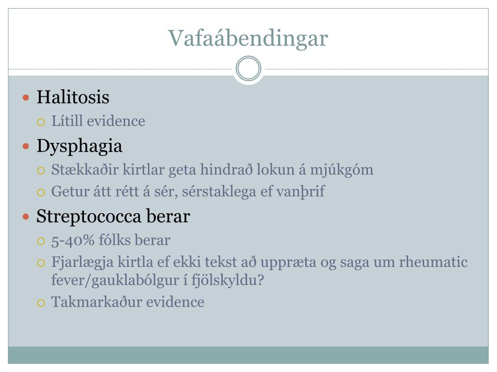Vafaábendingar • Halitosis • Lítillevidence • Dysphagia • Stækkaðirkirtlargetahindraðlokunámjúkgóm • Geturáttréttásér, sérstaklegaefvanþrif • Streptococcaberar • 5-40% fólksberar • Fjarlægjakirtlaefekkitekstaðupprætaog saga um rheumatic fever/gauklabólgurífjölskyldu? • Takmarkaður evidence