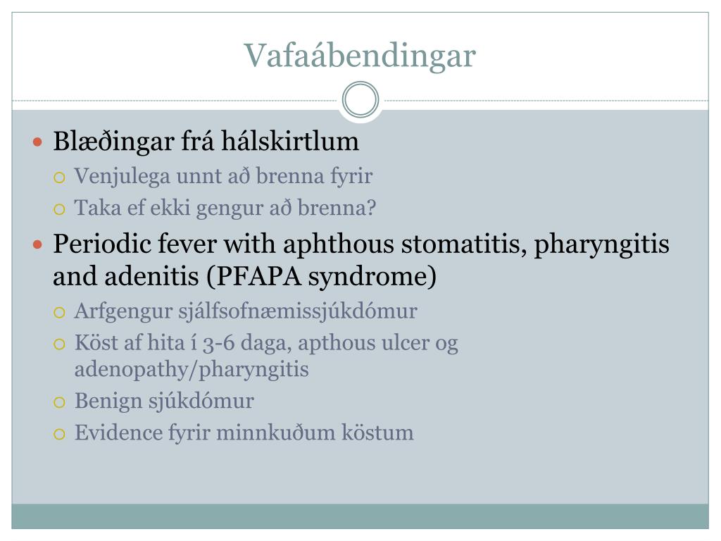 Vafaábendingar • Blæðingarfráhálskirtlum • Venjulegaunntaðbrennafyrir • Taka efekkigenguraðbrenna? • Periodic fever with aphthous stomatitis, pharyngitis and adenitis (PFAPA syndrome) • Arfgengursjálfsofnæmissjúkdómur • Köstafhitaí 3-6 daga, apthous ulcer ogadenopathy/pharyngitis • Benign sjúkdómur • Evidence fyrirminnkuðumköstum