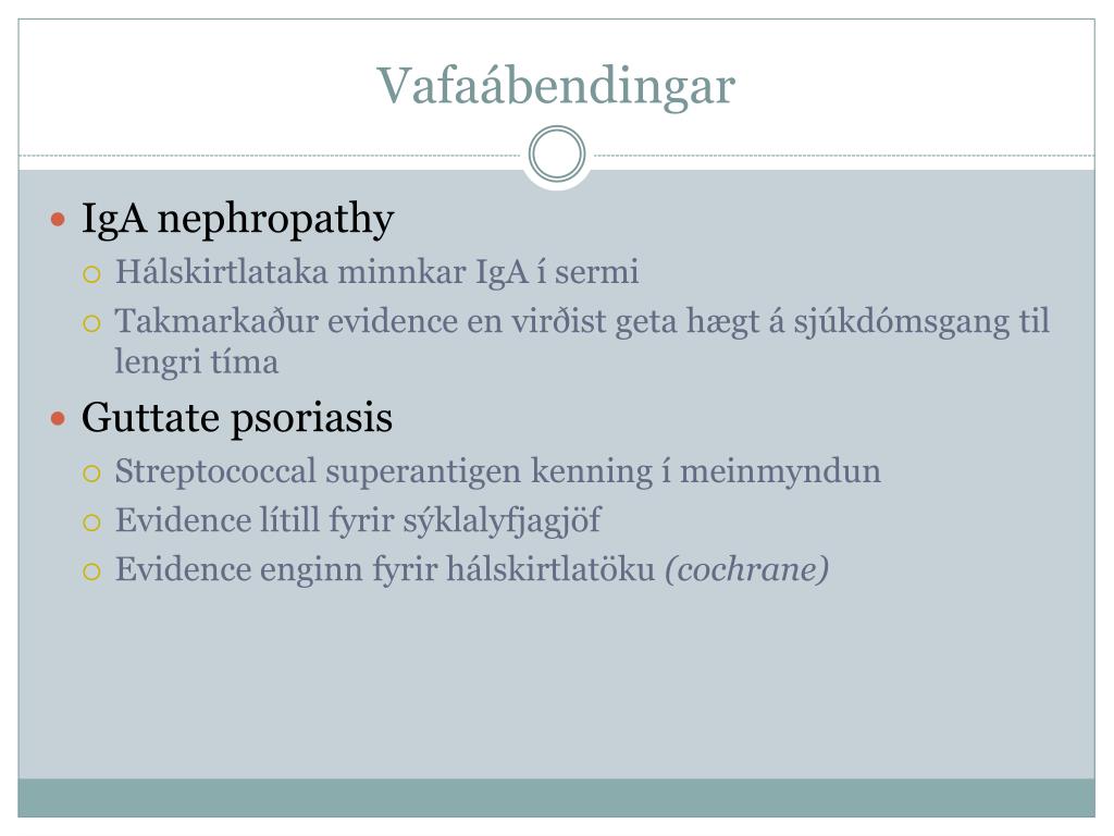 Vafaábendingar • IgA nephropathy • Hálskirtlatakaminnkar IgA ísermi • Takmarkaður evidence en virðistgetahægtásjúkdómsgangtillengritíma • Guttate psoriasis • Streptococcal superantigen kenning ímeinmyndun • Evidence lítillfyrirsýklalyfjagjöf • Evidence enginnfyrirhálskirtlatöku(cochrane)