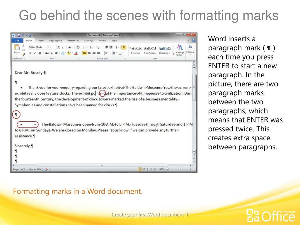 Go behind the scenes with formatting marks You can see what’s going on in your document by looking at the formatting marks that Word automatically inserts as you type. These marks are always in documents, but they are invisible to you until you display them. Formatting marks in a Word document. Imagine that you have typed a few paragraphs. The paragraphs seem very far apart, and the second paragraph starts farther to the right than the first paragraph. Create your first Word document II