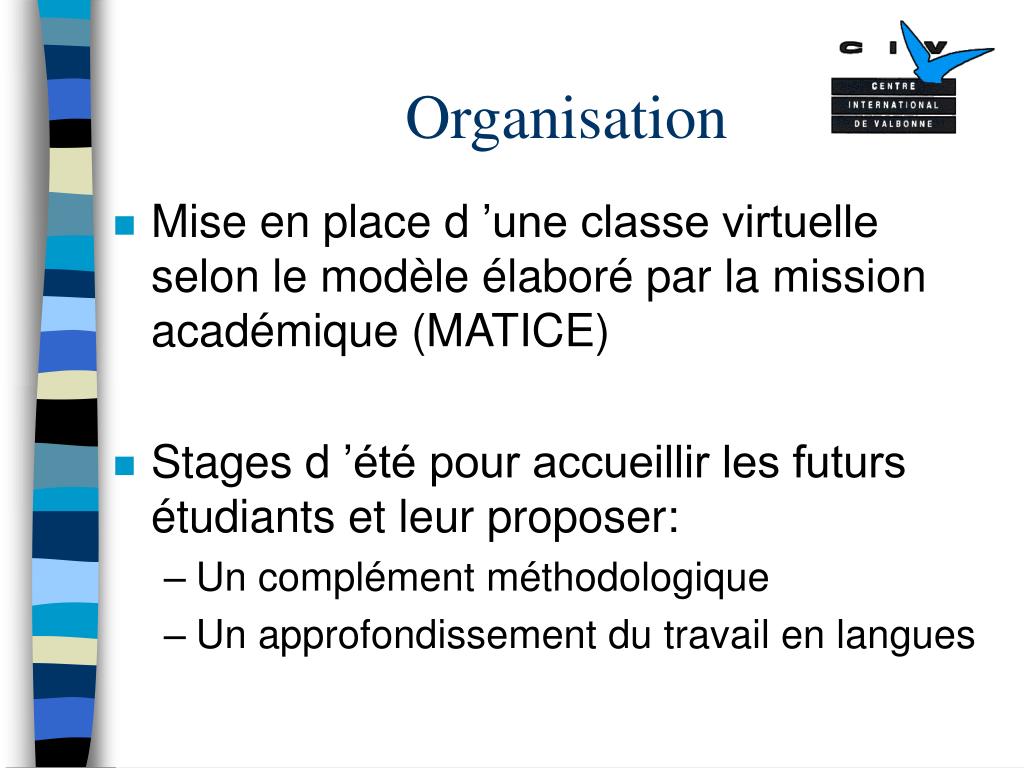 Organisation • Mise en place d ’une classe virtuelle selon le modèle élaboré par la mission académique (MATICE) • Stages d ’été pour accueillir les futurs étudiants et leur proposer: • Un complément méthodologique • Un approfondissement du travail en langues