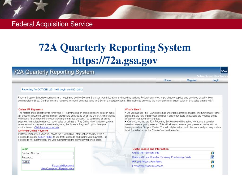 Remitting the IFF • Payment must be received within 30 calendar days after the quarter ends (not necessarily the last day of the month) • GSA encourages contractors to pay the IFF via credit card or electronic check because this will be a requirement in the near future • Visit https://72a.gsa.gov/for more information