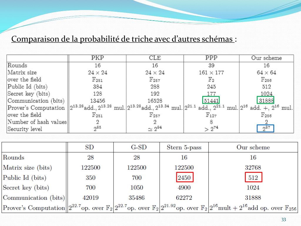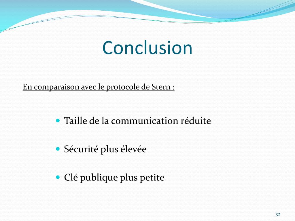 Conclusion En comparaison avec le protocole de Stern : • Taille de la communication réduite • Sécurité plus élevée • Clé publique plus petite