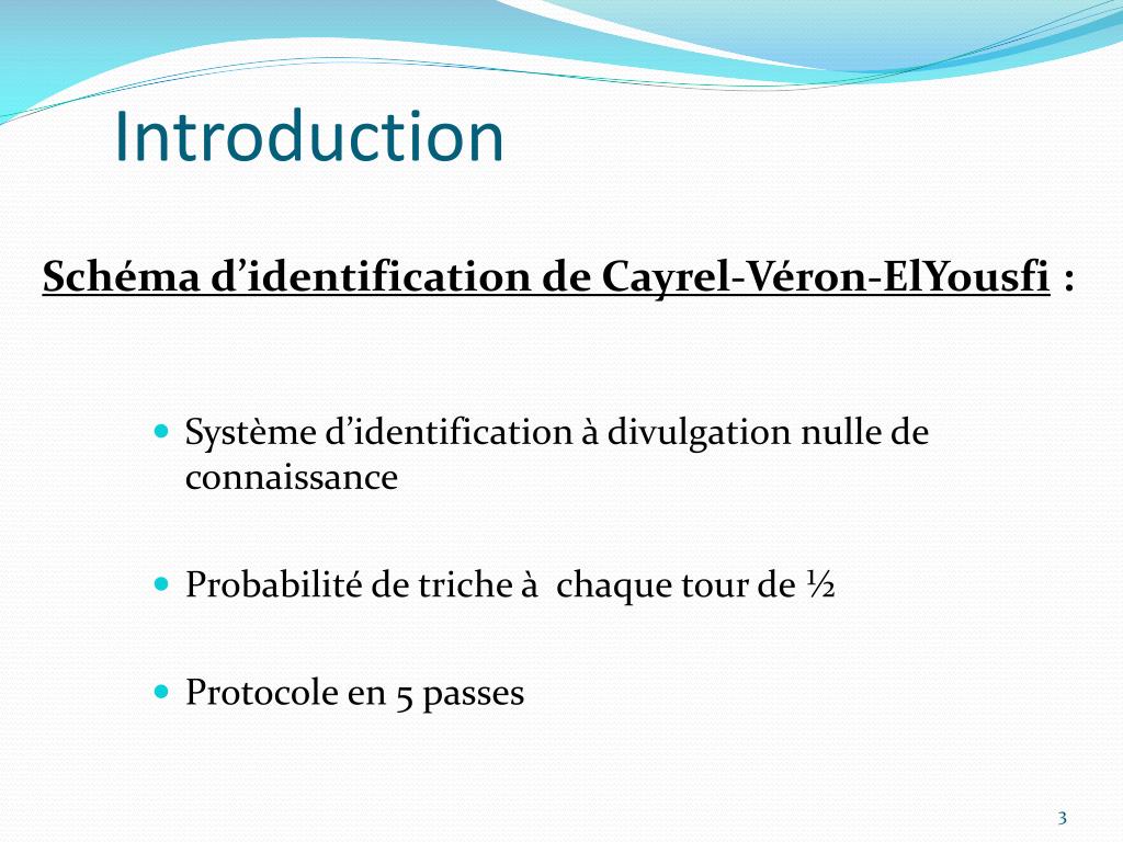 Schéma d’identification de Cayrel - Véron - ElYousfi. Anne-Sophie Tirloy Julien Armenti . Sommaire. Introduction Pré requis Présentation du schéma Sécurité et propriétés Conclusion. Introduction. Schéma d’identification de Cayrel - Véron - ElYousfi :.