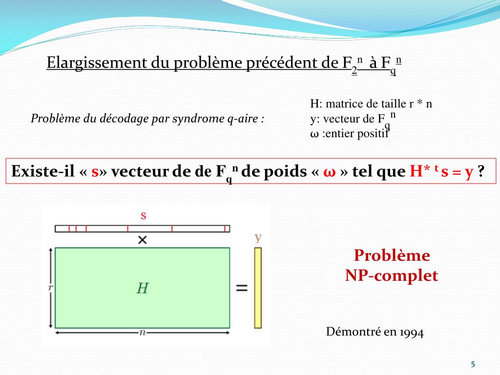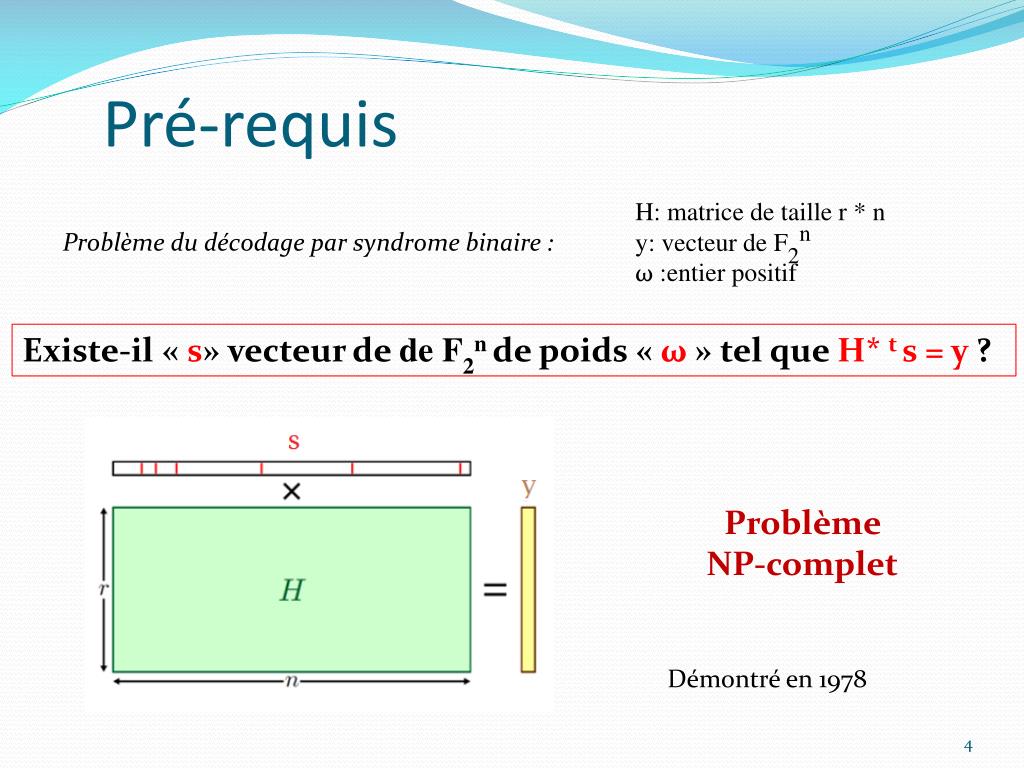 Pré-requis H: matrice de taille r * n y: vecteur de F2n ω :entier positif Problème du décodage par syndrome binaire : Existe-il « s» vecteur de de F2n de poids « ω » tel que H* t s = y ? Problème NP-complet Démontré en 1978