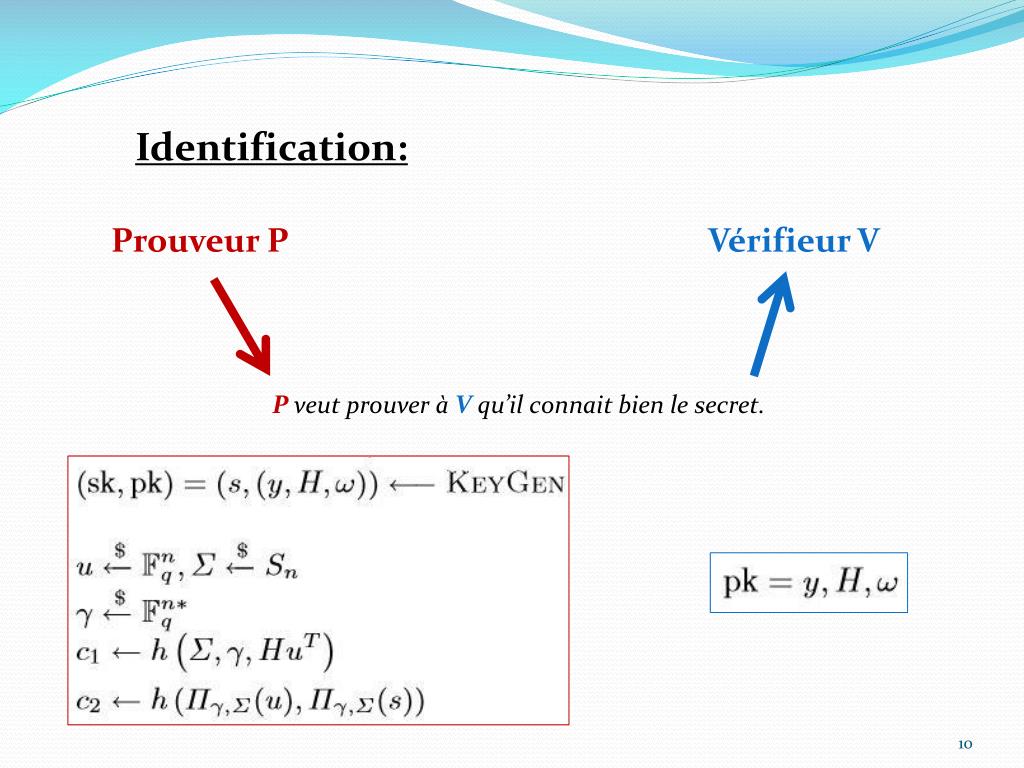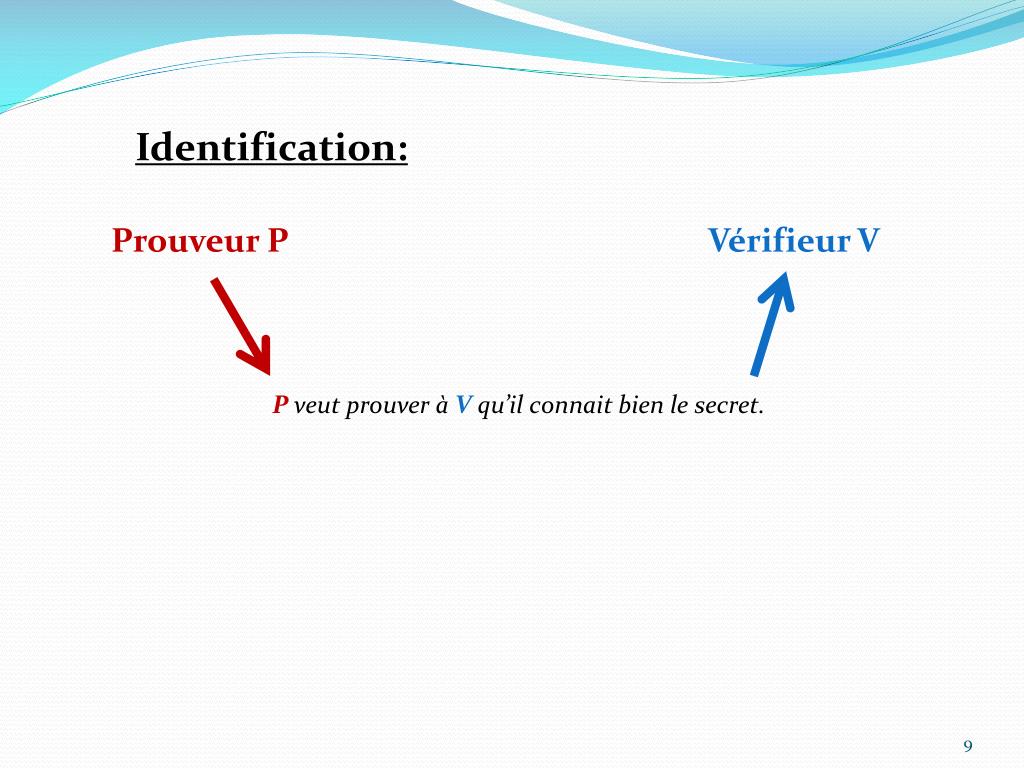Identification: Prouveur P Vérifieur V P veut prouver à V qu’il connait bien le secret.