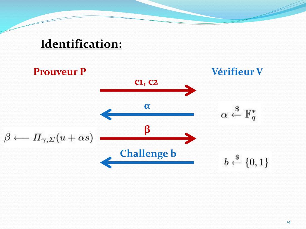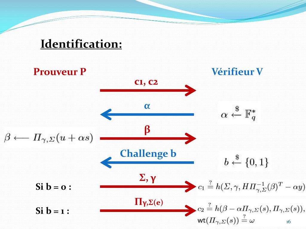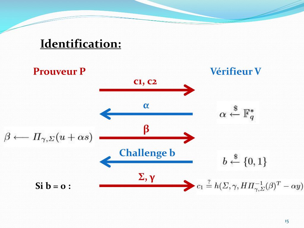 Identification: Prouveur P Vérifieur V c1, c2 α β Challenge b Σ, γ Si b = 0 : Πγ,Σ(e) Si b = 1 :