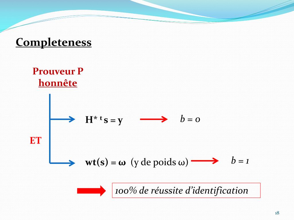 Completeness Prouveur P honnête b = 0 H* t s = y wt(s) = ω (y de poids ω) ET b = 1 100% de réussite d’identification
