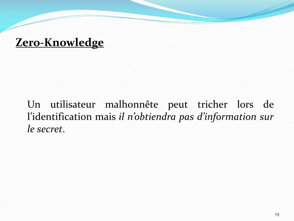 Zero-Knowledge Un utilisateur malhonnête peut tricher lors de l’identification mais il n’obtiendra pas d’information sur le secret.