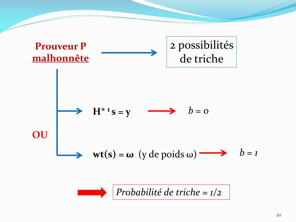 2 possibilités de triche Prouveur P malhonnête b = 0 H* t s = y wt(s) = ω (y de poids ω) OU b = 1 Probabilité de triche = 1/2