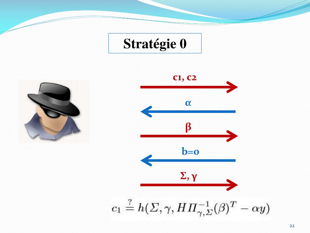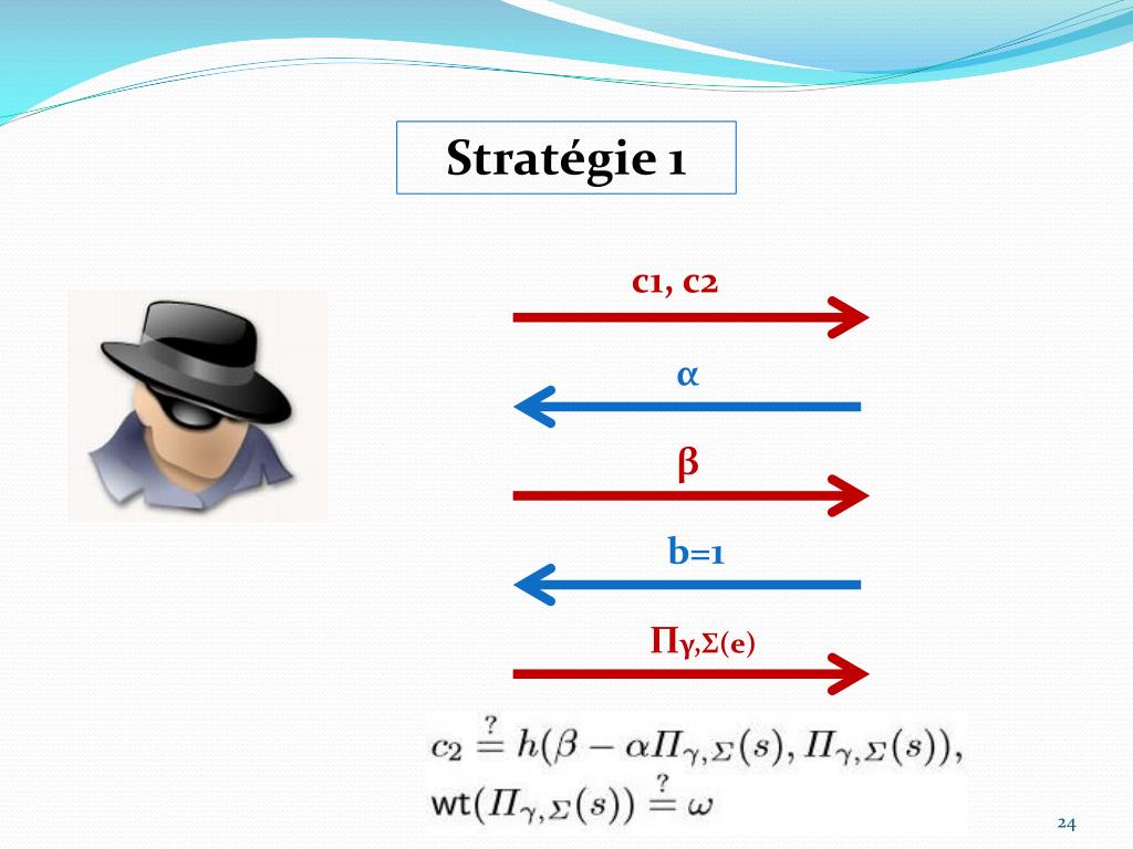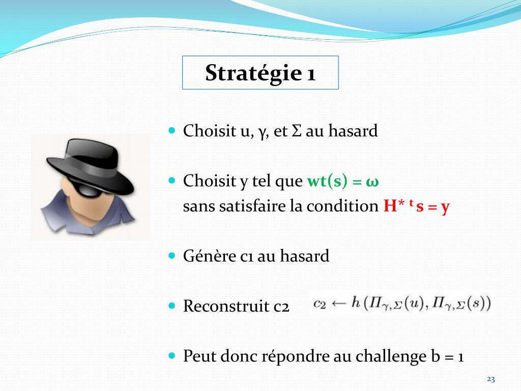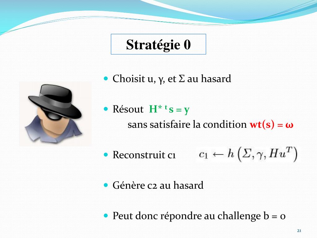Stratégie 1 • Choisit u, γ, et Σ au hasard • Choisit y tel que wt(s) = ω • sans satisfaire la condition H* t s = y • Génère c1 au hasard • Reconstruit c2 • Peut donc répondre au challenge b = 1