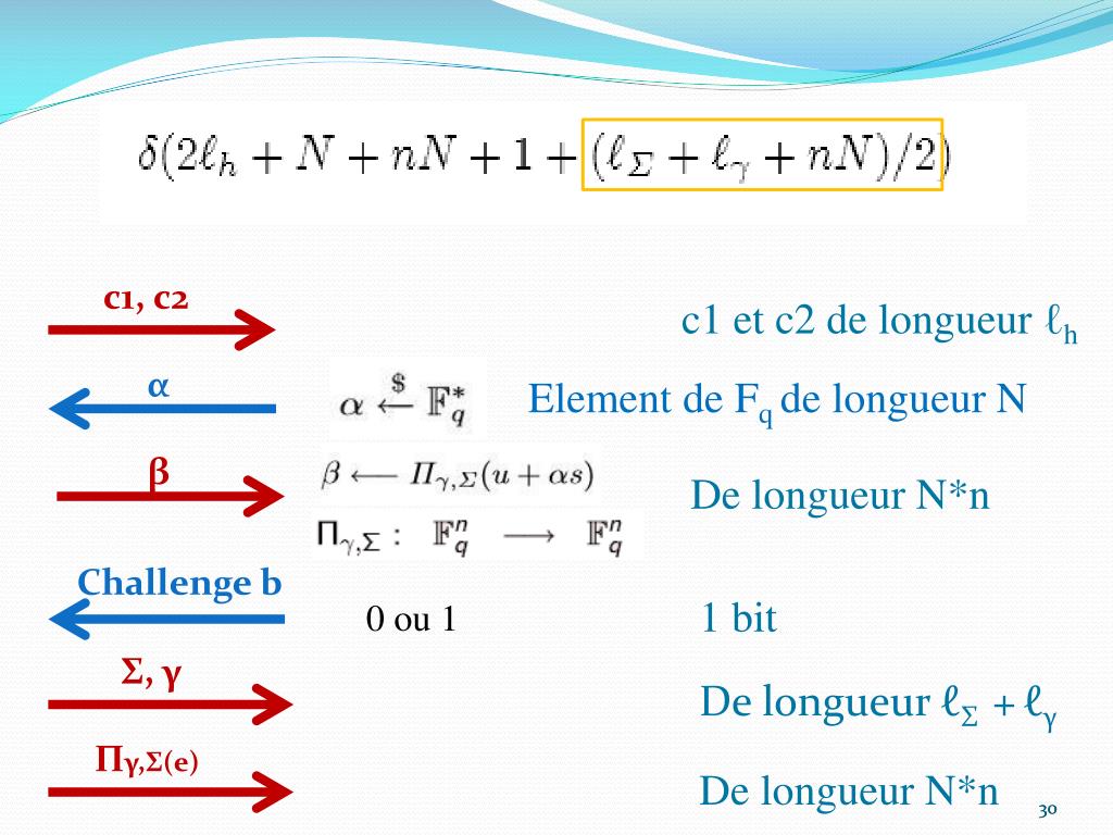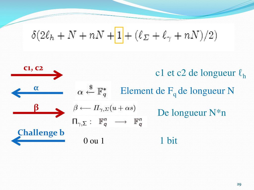 c1, c2 c1 et c2 de longueur ℓh α Element de Fqde longueur N β De longueur N*n Challenge b 1 bit 0 ou 1 29
