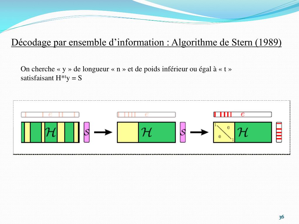 Décodage par ensemble d’information : Algorithme de Stern (1989) On cherche « y » de longueur « n » et de poids inférieur ou égal à « t » satisfaisant H*ty = S 36 36 36