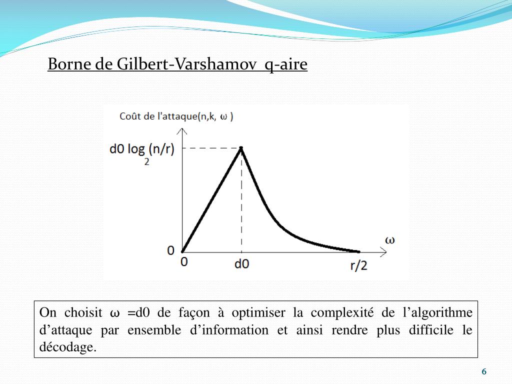 Borne de Gilbert-Varshamov q-aire On choisit ω=d0 de façon à optimiser la complexité de l’algorithme d’attaque par ensemble d’information et ainsi rendre plus difficile le décodage. 6 6