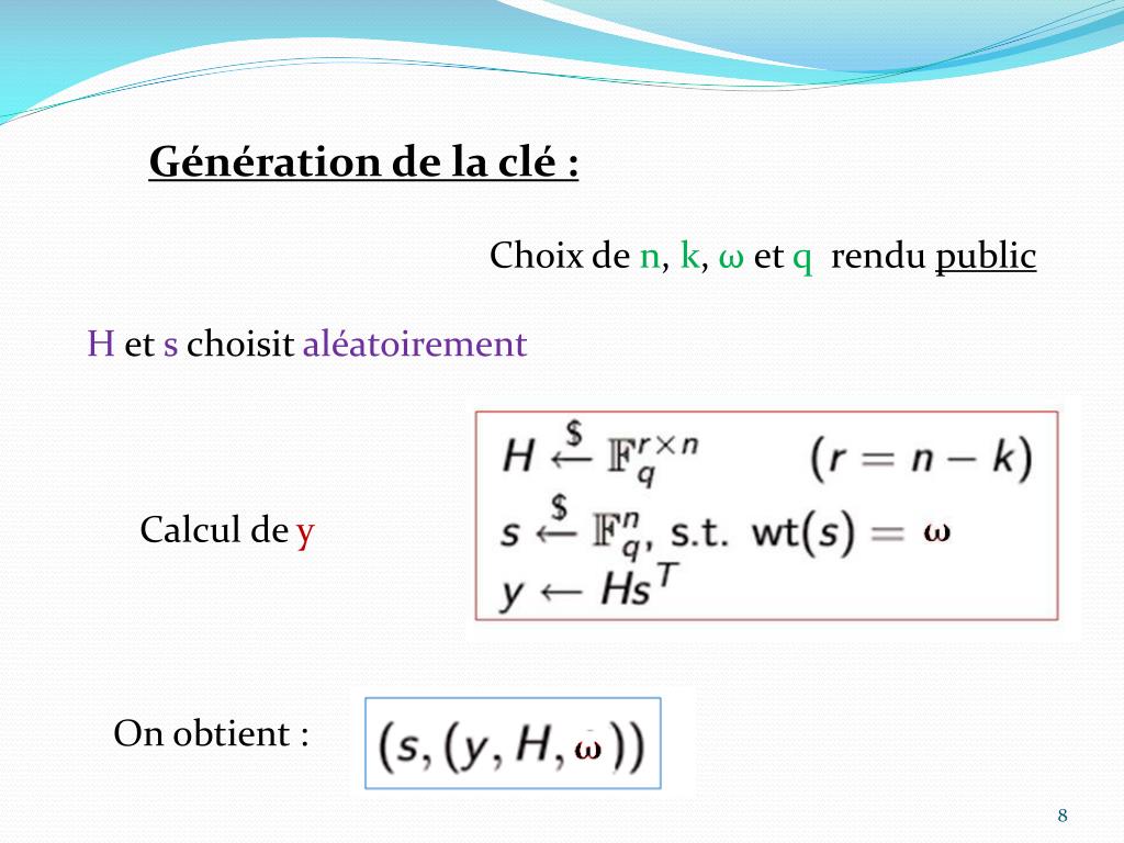 Génération de la clé : Choix de n, k, ωet q rendu public H et s choisit aléatoirement Calcul de y On obtient :