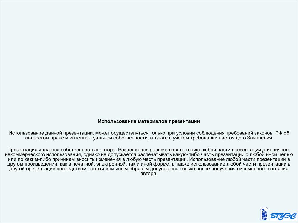 Использование материалов презентации Использование данной презентации, может осуществляться только при условии соблюдения требований законов РФ об авторском праве и интеллектуальной собственности, а также с учетом требований настоящего Заявления. Презентация является собственностью автора. Разрешается распечатывать копию любой части презентации для личного некоммерческого использования, однако не допускается распечатывать какую-либо часть презентации с любой иной целью или по каким-либо причинам вносить изменения в любую часть презентации. Использование любой части презентации в другом произведении, как в печатной, электронной, так и иной форме, а также использование любой части презентации в другой презентации посредством ссылки или иным образом допускается только после получения письменного согласия автора.