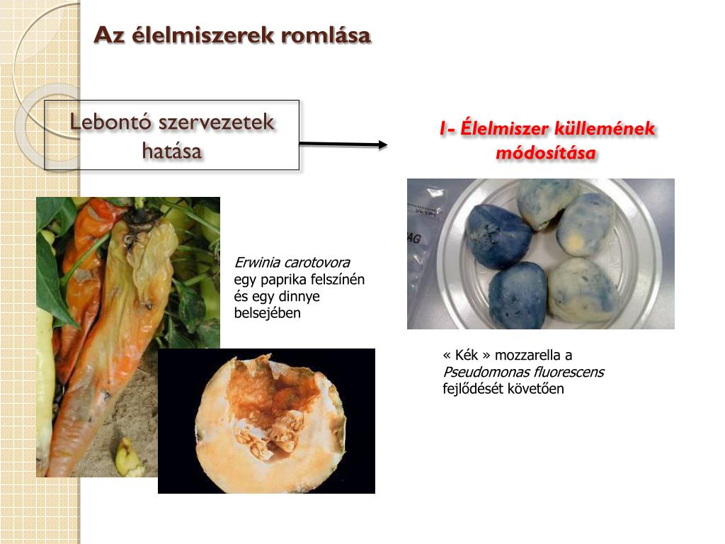 Az élelmiszerek romlása Lebontó szervezetek hatása 1- Élelmiszer küllemének módosítása Erwinia carotovoraegy paprika felszínén és egy dinnye belsejében « Kék » mozzarella a Pseudomonas fluorescensfejlődését követően