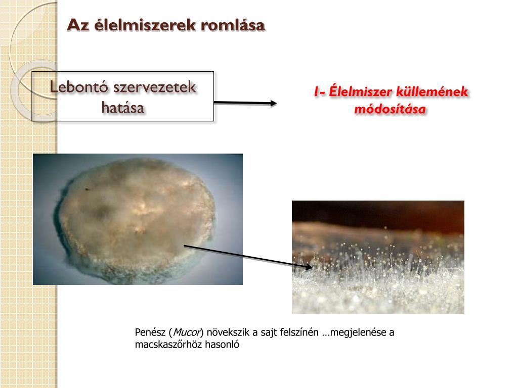 Az élelmiszerek romlása Lebontó szervezetek hatása 1- Élelmiszer küllemének módosítása Penész (Mucor) növekszik a sajt felszínén …megjelenése a macskaszőrhöz hasonló