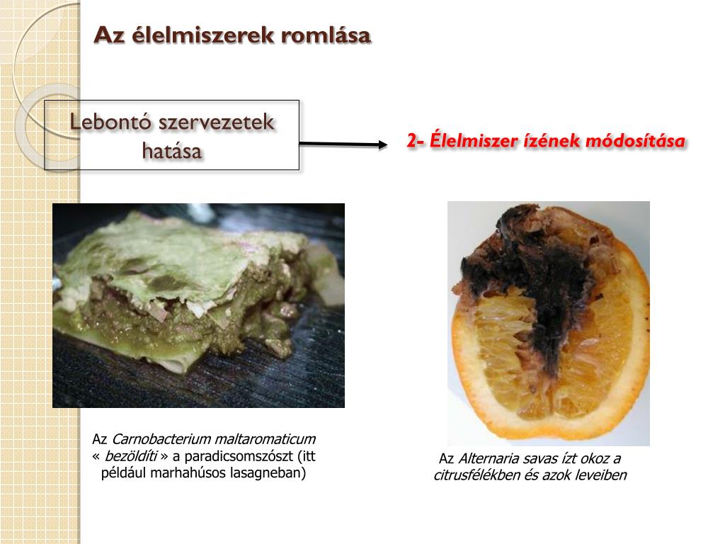 Az élelmiszerek romlása Lebontó szervezetek hatása 2- Élelmiszer ízének módosítása Az Carnobacterium maltaromaticum « bezöldíti » a paradicsomszószt (itt például marhahúsos lasagneban) Az Alternaria savas ízt okoz a citrusfélékben és azok leveiben
