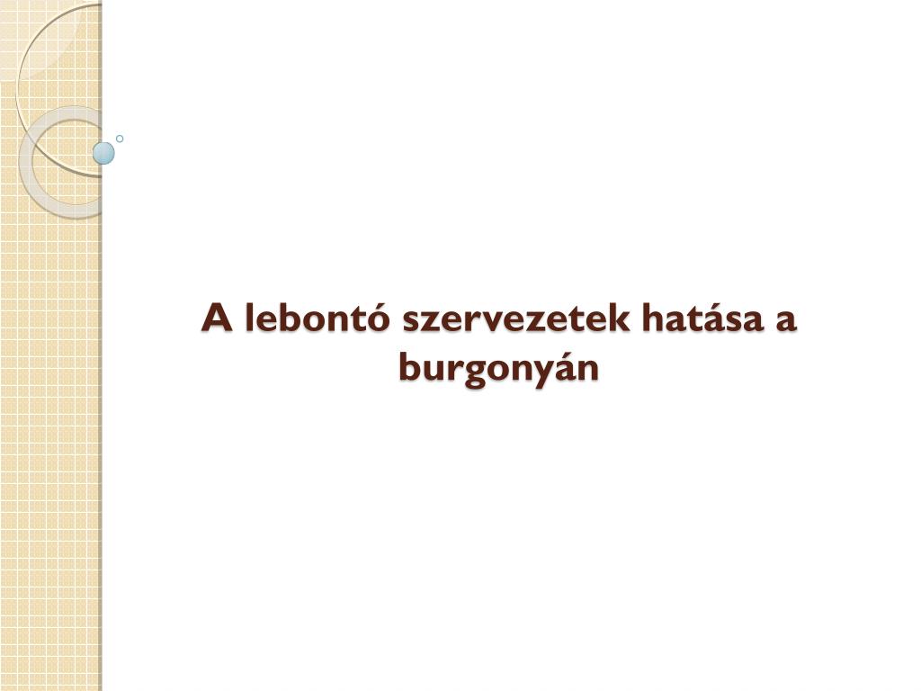 A burgonya kórokozó-baktériumjainak példája: Pectobacterium Pectobacterium (új elnevezés az Erwiniacsoport számára) : baktérium azenterobaktériumok családjából, számos növény kórokozója, növények és gumók pusztulását okozza néhány fontos faj (P.carotovorum, P.atrosepticum…) P.atrosepticum (x 2850) Burgonyagumó pusztulásaP.atrosepticumáltal