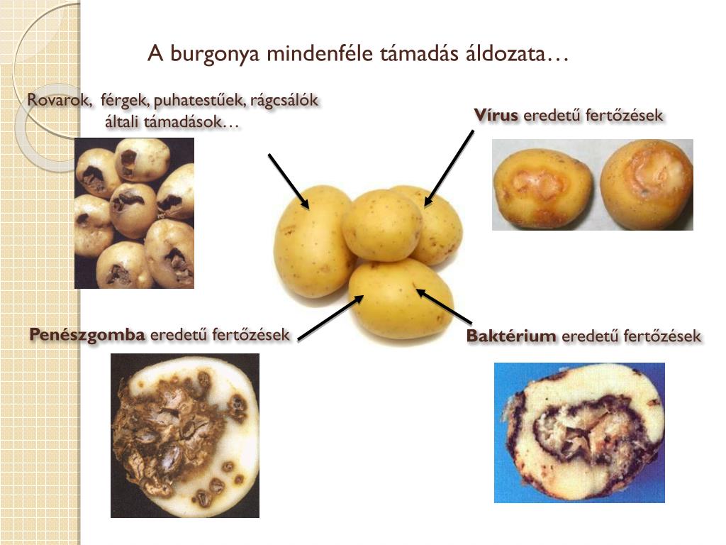 A burgonya mindenféle támadás áldozata… Rovarok, férgek, puhatestűek, rágcsálók általi támadások… Víruseredetűfertőzések Penészgombaeredetű fertőzések Baktériumeredetűfertőzések