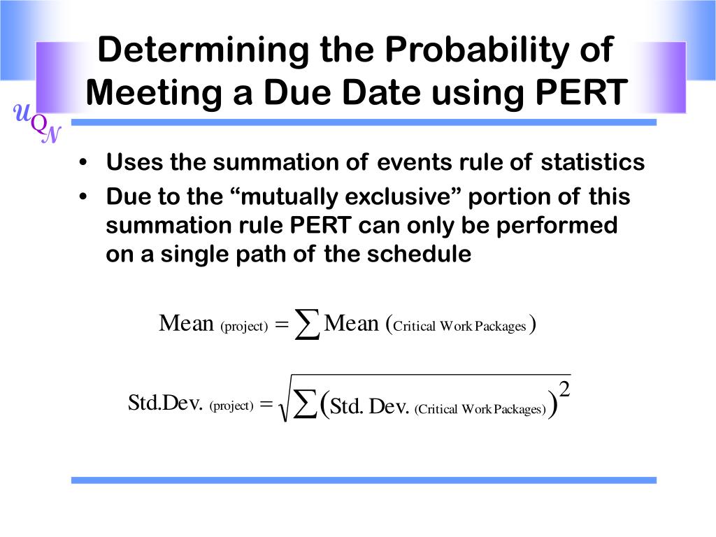 Determining the Probability of Meeting a Due Date using PERT • Uses the summation of events rule of statistics • Due to the “mutually exclusive” portion of this summation rule PERT can only be performed on a single path of the schedule
