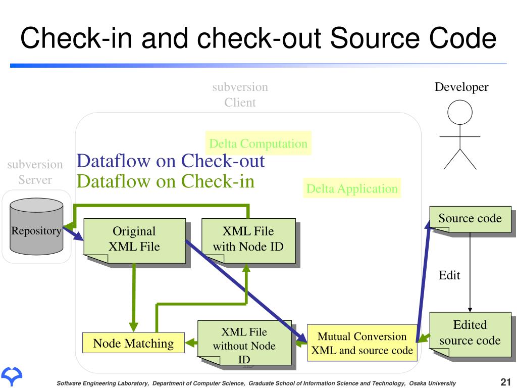 Check-in and check-out Source Code subversion Client Developer Delta Computation Dataflow on Check-out subversion Server Dataflow on Check-in Delta Application Repository Source code Original XML File XML File with Node ID Edit Edited source code XML File without Node ID Mutual Conversion XML and source code Node Matching