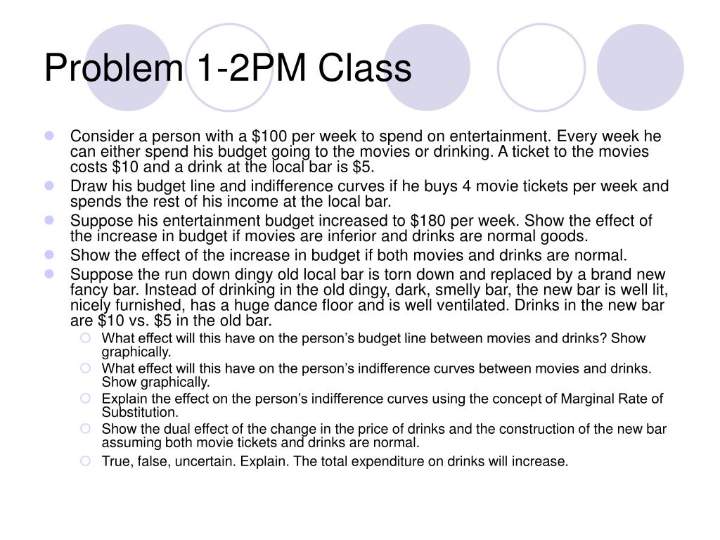 Problem 1-2PM Class • Consider a person with a $100 per week to spend on entertainment. Every week he can either spend his budget going to the movies or drinking. A ticket to the movies costs $10 and a drink at the local bar is $5. • Draw his budget line and indifference curves if he buys 4 movie tickets per week and spends the rest of his income at the local bar. • Suppose his entertainment budget increased to $180 per week. Show the effect of the increase in budget if movies are inferior and drinks are normal goods. • Show the effect of the increase in budget if both movies and drinks are normal. • Suppose the run down dingy old local bar is torn down and replaced by a brand new fancy bar. Instead of drinking in the old dingy, dark, smelly bar, the new bar is well lit, nicely furnished, has a huge dance floor and is well ventilated. Drinks in the new bar are $10 vs. $5 in the old bar. • What effect will this have on the person’s budget line between movies and drinks? Show graphically. • What effect will this have on the person’s indifference curves between movies and drinks. Show graphically. • Explain the effect on the person’s indifference curves using the concept of Marginal Rate of Substitution. • Show the dual effect of the change in the price of drinks and the construction of the new bar assuming both movie tickets and drinks are normal. • True, false, uncertain. Explain. The total expenditure on drinks will increase.