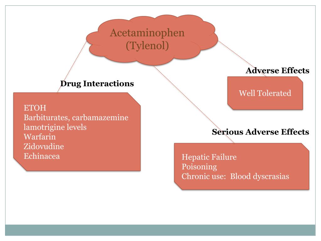 Acetaminophen (Tylenol) Adverse Effects Drug Interactions Well Tolerated ETOH Barbiturates, carbamazemine lamotrigine levels Warfarin Zidovudine Echinacea Serious Adverse Effects Hepatic Failure Poisoning Chronic use: Blood dyscrasias