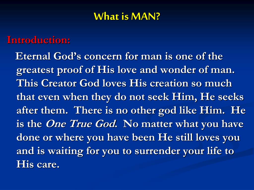 What is MAN? Introduction: Eternal God’s concern for man is one of the greatest proof of His love and wonder of man. This Creator God loves His creation so much that even when they do not seek Him, He seeks after them. There is no other god like Him. He is the One True God. No matter what you have done or where you have been He still loves you and is waiting for you to surrender your life to His care.