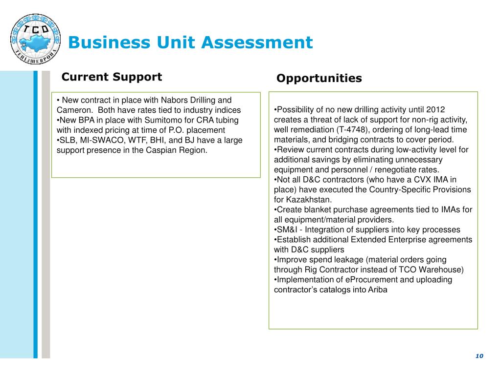 Business Unit Assessment Current Support Opportunities • Possibility of no new drilling activity until 2012 creates a threat of lack of support for non-rig activity, well remediation (T-4748), ordering of long-lead time materials, and bridging contracts to cover period. • Review current contracts during low-activity level for additional savings by eliminating unnecessary equipment and personnel / renegotiate rates. • Not all D&C contractors (who have a CVX IMA in place) have executed the Country-Specific Provisions for Kazakhstan. • Create blanket purchase agreements tied to IMAs for all equipment/material providers. • SM&I - Integration of suppliers into key processes • Establish additional Extended Enterprise agreements with D&C suppliers • Improve spend leakage (material orders going through Rig Contractor instead of TCO Warehouse) • Implementation of eProcurement and uploading contractor’s catalogs into Ariba • New contract in place with Nabors Drilling and Cameron. Both have rates tied to industry indices • New BPA in place with Sumitomo for CRA tubing with indexed pricing at time of P.O. placement • SLB, MI-SWACO, WTF, BHI, and BJ have a large support presence in the Caspian Region.