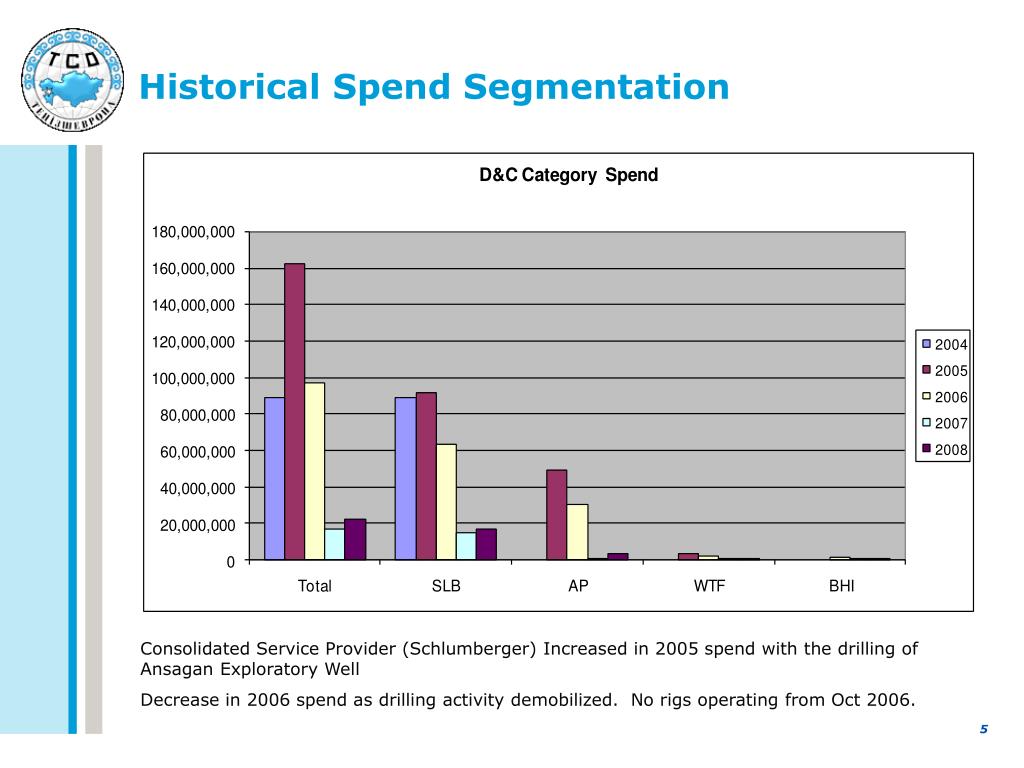 Historical Spend Segmentation Consolidated Service Provider (Schlumberger) Increased in 2005 spend with the drilling of Ansagan Exploratory Well Decrease in 2006 spend as drilling activity demobilized. No rigs operating from Oct 2006.