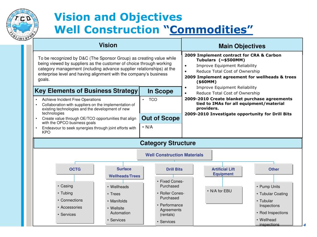 Vision and ObjectivesWell Construction “Commodities” Main Objectives Vision To be recognized by D&C (The Sponsor Group) as creating value while being viewed by suppliers as the customer of choice through working category management (including advance supplier relationships) at the enterprise level and having alignment with the company’s business goals. • 2009 Implement contract for CRA & Carbon Tubulars (~$500MM) • Improve Equipment Reliability • Reduce Total Cost of Ownership • 2009 Implement agreement for wellheads & trees ($60MM) • Improve Equipment Reliability • Reduce Total Cost of Ownership • 2009-2010 Create blanket purchase agreements tied to IMAs for all equipment/material providers. • 2009-2010 Investigate opportunity for Drill Bits Key Elements of Business Strategy In Scope • Achieve Incident Free Operations • Collaboration with suppliers on the implementation of existing technologies and the development of new technologies • Create value through OE/TCO opportunities that align with the OPCO business goals • Endeavour to seek synergies through joint efforts with KPO • TCO Out of Scope • N/A Category Structure Well Construction Materials OCTG Drill Bits Other Surface Wellheads/Trees Artificial Lift Equipment • Fixed Cones-Purchased • Roller Cones-Purchased • Performance Agreements (rentals) • Services • Casing • Tubing • Connections • Accessories • Services • Pump Units • Tubular Coating • Tubular Inspections • Rod Inspections • Wellhead inspections • Wellheads • Trees • Manifolds • Wellsite Automation • Services • N/A for EBU