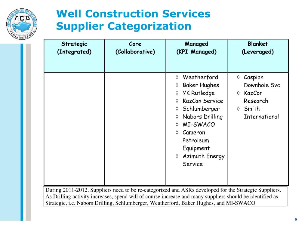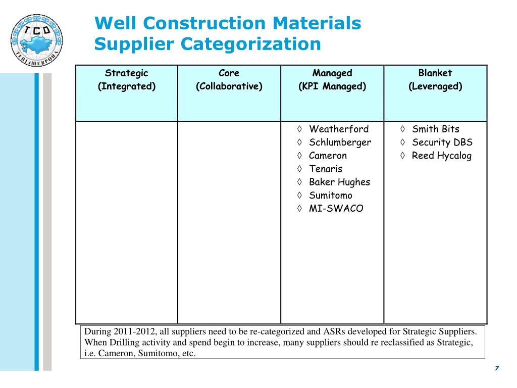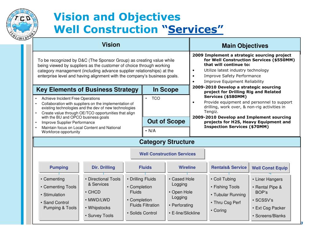 Vision and ObjectivesWell Construction “Services” Vision Main Objectives To be recognized by D&C (The Sponsor Group) as creating value while being viewed by suppliers as the customer of choice through working category management (including advance supplier relationships) at the enterprise level and having alignment with the company’s business goals. • 2009 Implement a strategic sourcing project for Well Construction Services ($550MM) that will continue to: • Utilize latest industry technology • Improve Safety Performance • Improve Equipment Reliability • 2009-2010 Develop a strategic sourcing project for Drilling Rig and Related Services ($580MM) • Provide equipment and personnel to support drilling, work over, & non-rig activities in Tengiz. • 2009-2010 Develop and Implement sourcing projects for H2S, Heavy Equipment and Inspection Services ($70MM) Key Elements of Business Strategy In Scope • TCO • Achieve Incident Free Operations • Collaboration with suppliers on the implementation of existing technologies and the dev of new technologies • Create value through OE/TCO opportunities that align with the BU and OPCO business goals • Improve Supplier Performance • Maintain focus on Local Content and National Workforce opportunity Out of Scope • N/A Category Structure Well Construction Services Pumping Dir. Drilling Fluids Wireline Rentals& Service Well Const Equip Well Const Equip • Cementing • Cementing Tools • Stimulation • Sand Control Pumping & Tools • Directional Tools & Services • CHCD • MWD/LWD • Whipstocks • Survey Tools • Drilling Fluids • Completion Fluids • Completion Fluids Filtration • Solids Control • Cased Hole Logging • Open Hole Logging • Perforating • E-line/Slickline • Coil Tubing • Fishing Tools • Tubular Running • Thru Csg Perf • Coring • Liner Hangers • Rental Pipe & BOP‘s • SCSSV‘s • Ext Csg Packer • Screens/Blanks