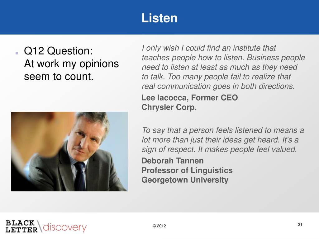 Listen I only wish I could find an institute that teaches people how to listen. Business people need to listen at least as much as they need to talk. Too many people fail to realize that real communication goes in both directions. Lee Iacocca, Former CEO Chrysler Corp. To say that a person feels listened to means a lot more than just their ideas get heard. It's a sign of respect. It makes people feel valued. Deborah TannenProfessor of Linguistics Georgetown University • Q12 Question:At work my opinions seem to count.