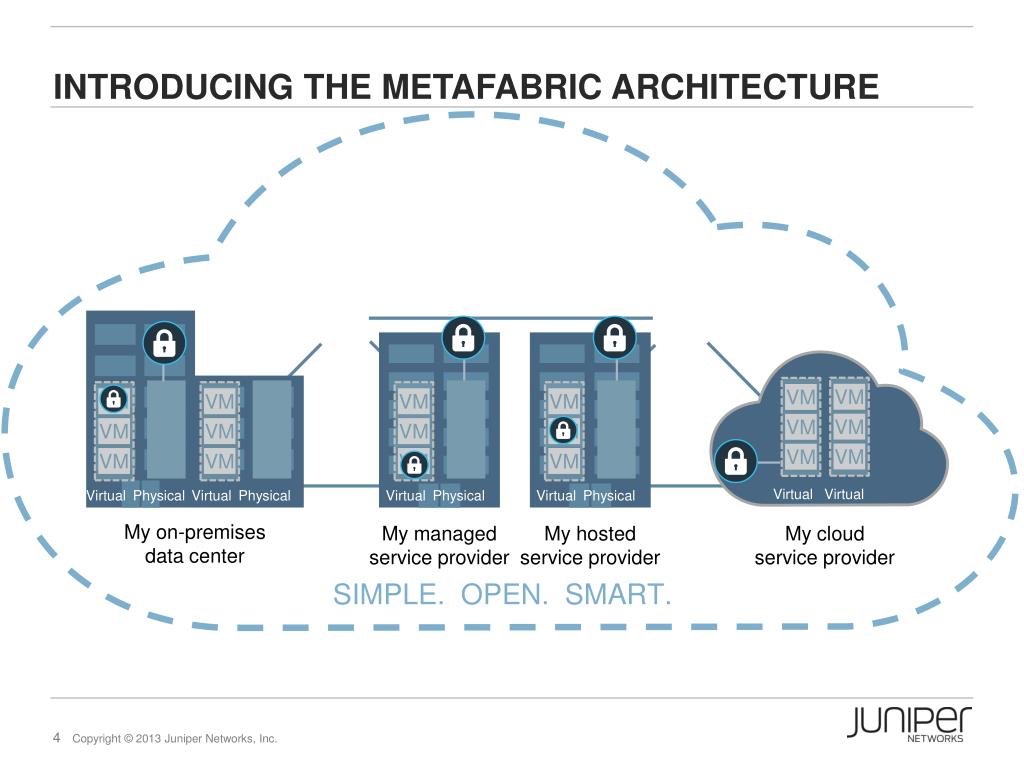 Introducing THE MetaFabric ARCHITECTURE VM VM VM VM VM VM VM VM VM VM VM VM VM VM VM VM VM VM Virtual Virtual My on-premisesdata center My managedservice provider My hostedservice provider My cloudservice provider Virtual Virtual Virtual Virtual Physical Physical Physical Physical SIMPLE.OPEN. SMART.
